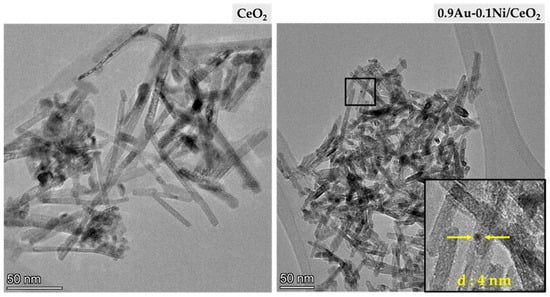 Figure 5 shows the HRTEM micrographs of the bare CeO2 and of the sample with the best photocatalytic performance (0.9Au-0.1Ni/CeO2). For the bare CeO2 sample, the observed morphology consists of nanorods approximately 57 nm long and about 7 nm wide. The morphology observed for this solid is similar to the one found in the literature for ceria and Y-doped CeO2 samples synthesized with comparable experimental procedures [44,45]. In accordance with the literature, such a nanorod-like structure may contribute to the high surface area of this sample (273.5 m2/g).