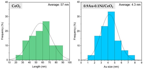 The average size of the metal nanoparticles incorporated on CeO2 was also studied with this technique. Due to the very low amount of Ni incorporated (0.1 wt.%), this element could not be observed through transmission microscopy, and it was assumed that the metal nanoparticles found were gold. The study of the particle size distribution showed that the average Au size was around 4.3 nm. The distribution histograms of the Au average size and the length of the CeO2 nanorods are shown in Figure 6.