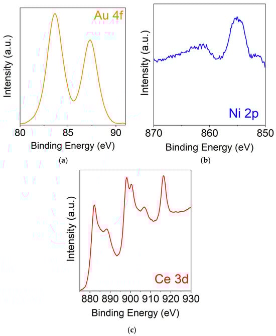 The XRD analyses of the Ni/CeO2 and Au/CeO2 samples do not reveal any additional Au- or Ni-based phases. This is likely due to the low Au and Ni content combined with the high dispersion of these phases. Similarly, in the bimetallic Au-Ni/CeO2 samples, no distinct peaks corresponding to NiO or separate Au phases are visible. It is reported in the literature that the the incorporation of Ni2⁺ into the CeO2 lattice, likely through partial substitution of Ce4⁺ due to their similar ionic radii, leads to a contraction of the CeO2 structure along with an enlargement of the peaks due to an increase of the crystallographic disorder [38]. The formation of solid solutions where ionic gold species are strongly interacting with the support or stabilized into the ceria lattice are also reported in the literature [39,40]. Depending on the Au oxidation state and ionic radius, the ceria cell volume can increase or decrease with a consequent shift of the crystalline peaks. In our case, no evident shifts of the ceria peaks were observed in the monometallic samples, nor in the bimetallic ones, probably due to the low amount of Ni and in accordance with the formation of small Au nanoparticles (as detected by HRTEM), likely in the metallic state (as verified by XPS). The only noticeable effect is that the peaks of the pure ceria are broader than those of the other samples; this is consistent with the larger surface area of the ceria, which, in the other catalysts, instead decreases (Table 1).