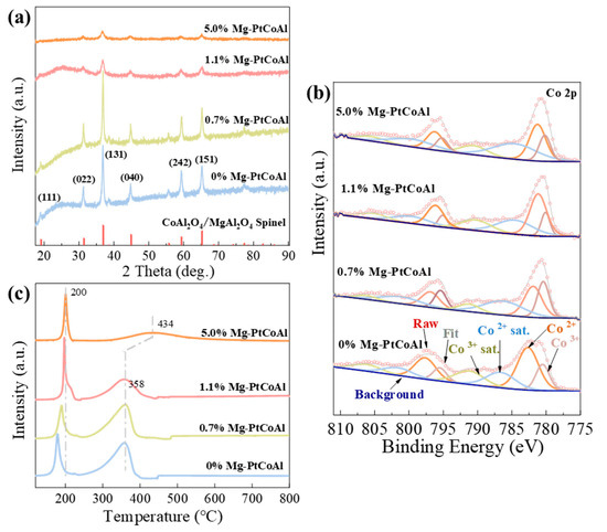 (a) XRD patterns of calcined x% Mg-PtCoAl catalysts. (b) Co 2p XPS spectrum of the calcined x% Mg-PtCoAl catalysts. (c) H2-TPR profiles of the x% Mg-PtCoAl catalysts.