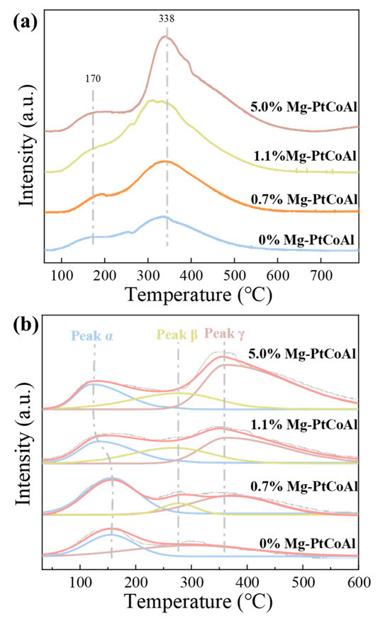 H2 temperature-programmed desorption (TPD) was employed to investigate the H2 activation capabilities of Mg-modified PtCoAl catalysts (Figure 2a and Table 2). The data reveal two distinct adsorption peaks: a low-temperature peak between 150 and 200 °C, representing weakly adsorbed hydrogen, and a peak between 300 and 350 °C, associated with strongly adsorbed hydrogen [35]. As the Mg content increases from 0% to 1.1% in the PtCoAl catalysts, the H2 uptake rises from 301.8 to 596.7 μmolH2 gcat−1 and starts to decrease with further increasing Mg content. This may be attributed to enhanced hydrogen adsorption/activation induced by the Mg promoter [36]. Even though the uptake of weakly adsorbed hydrogen (H2 uptake before 250 °C) follows a similar trend to the total H2 uptake, its fraction shows a decreasing trend.