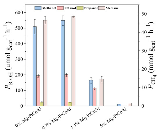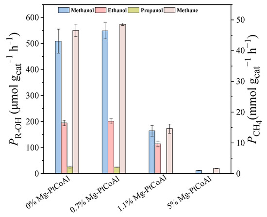 The performance of Mg-modified PtCoAl catalysts for CO2 hydrogenation was evaluated. CO2 hydrogenation on Mg-modified PtCoAl catalysts primarily produces methane, with trace amounts of methanol, ethanol, and propanol (Figure 3). The reaction conditions were established based on previous studies: a reaction temperature of 180 °C, an initial pressure of 4 MPa, water as the solvent, and 50 mg of catalyst were used [23]. It was observed that, with increasing Mg concentration in the PtCoAl catalysts, the productivity of various products initially increases and then decreases with excessive Mg amounts. The highest productivities for methane (48.6 mmol gcat−1 h−1), methanol (549.0 μmol gcat−1 h−1), and higher alcohols (226.7 μmol gcat−1 h−1) are achieved with 0.7% Mg-PtCoAl. When the Mg content exceeds 1.1%, a significant decrease in the productivities of various products is observed. At 5.0% Mg content, the productivities for methane and methanol drop to 1.7 mmol gcat−1 h−1 and 12.3 μmol gcat−1 h−1, respectively, and no ethanol or propanol is formed.