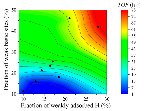 Figure 4 shows the correlation for the fraction of weakly adsorbed H and the fraction of weak basic sites with CO2 hydrogenation TOFs. It can be observed that relatively low fractions of weak basic sites (<18.5%) and weakly adsorbed H (<21.1%) both lead to unsatisfactory TOF (<12.5 and 22.7 h−1, the blue area in the figure). A relatively high fraction of weak basic sites with relatively low fraction of weakly adsorbed H leads to a medium TOF level (54 h−1, the green area in the figure). However, when the catalyst has both a high fraction of weakly adsorbed H and a high fraction of weak basic sites, the highest TOF (up to 78 h−1, the red area in the figure) can be achieved. This indicates that both weakly adsorbed H and weak basic sites are of great importance for efficient CO2 hydrogenation. According to previous reports, weak basic sites are crucial for the adsorption and activation of CO2 [43,44]. Therefore, a relatively large number of weak basic sites is the key reason for enhancing the activity of the catalyst regarding CO2 hydrogenation. Even though Mg reduces the fraction of weakly adsorbed H, it optimizes the fraction of weak basic sites and increases the amount of active sites (Figure S2), leading to high apparent activity for 0.7% Mg-PtCoAl. However, a high Mg content, such as 5.0%, may lead to agglomeration of MgO on the catalyst surface, forming more sites with strong basicity and resulting in an increase in the total number of basic sites. The increase in the density of strong basic sites causes the catalyst to promote excessively strong CO2 adsorption, making it difficult to carry out subsequent reactions. Additionally, excessive Mg may cover the originally active weak basic sites, leading to a decrease in the density of surface weak basic sites and resulting in the lowest TOF and productivity.