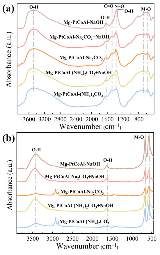 The catalysts’ precursors were analyzed using FT-IR (Thermo Scientific Nicolet iS20, Waltham, MA, USA) to investigate differences in chemical bonding. For the precipitated sample (Figure 5a), a broad absorption band at approximately 3479 cm−1 and a band at 1633 cm−1 are attributed to the stretching vibrations of bound water and hydroxyl groups (O–H) [45]. Absorption bands around 1483 cm−1 and 1383 cm−1 correspond to the stretching vibrations of carbonate (C=O) and nitrate (N=O), respectively [46,47]. Notably, in the precursor prepared with NaOH as the precipitant, the carbonate absorption band disappears. Furthermore, the samples synthesized using only NaOH as the precipitant exhibit a more intense peak at 1352 cm−1, likely due to the binding of metal to the OH group [48,49]. Absorption bands in the range of 500–1000 cm−1 are associated with the stretching and bending vibrations of metal-oxygen bonds, specifically Al–O at 572 cm−1 and Co–O at 667 cm−1 [50,51]. The precursors of the samples precipitated with NaOH are mainly hydroxides, while the precipitants containing carbonate will retain the intercalated carbonate species, thus forming an LDH-like structure.