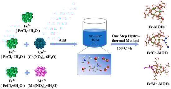 The following analytical grade chemicals were obtained from commercial suppliers and used without further purification: anhydrous ethanol (≥99.5%) and N, N-dimethylacetamide (>99.0%) (Tianjin Comio Chemical Reagent Co., Ltd., Tianjin, China); nitroterephthalic acid (≥98.0%), iron (III) chloride hexahydrate (>99.0%), cobalt (II) nitrate hexahydrate (≥99.0%), and manganese (II) nitrate tetrahydrate (≥98.0%) (Aladdin Reagent (Shanghai) Co., Ltd., Shanghai, China).