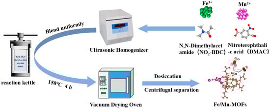 The preparation methods for Fe/Co-MOFs and Fe-MOFs catalysts are identical to that of Fe/Mn-MOFs, with the only difference being the use of different reactants. For the Fe/Co-MOFs catalyst, 0.15 mmol (40.50 mg) of FeCl3·6H2O and 0.15 mmol (43.40 mg) of Co(NO3)2·6H2O were used. For the Fe-MOFs catalyst, 0.30 mmol (81.00 mg) of FeCl3·6H2O was used. Given the use of nitro-functionalized terephthalic acid (NO2-BDC) as the organic linker and the adopted hydrothermal conditions, the synthesized catalysts are classified as MIL-type MOFs. The specific synthetic route is shown in Figure 2.