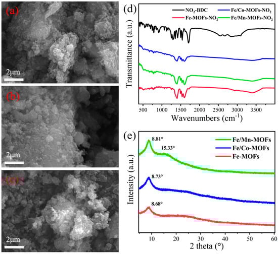 (a–c) SEM images, (d) FT-IR spectra, and (e) XRD patterns of Fe-MOFs, Fe/Co-MOFs, and Fe/Mn-MOFs catalysts.
