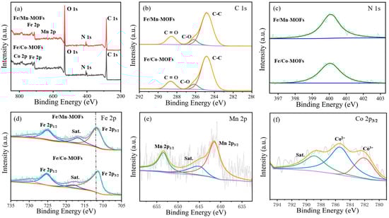 XPS spectra of Fe/Mn-MOFs and Fe/Co-MOFs (a) Survey. (b) C 1s XPS spectra. (c) N 1s XPS spectra. (d) Fe 2p XPS spectra. (e) Mn 2p XPS spectrum. (f) Co 2p3/2 XPS spectrum.