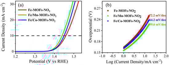 (a) OER polarization curves and (b) Tafel curves of Fe-MOFs, Fe/Co-MOFs, and Fe/Mn-MOFs catalysts.