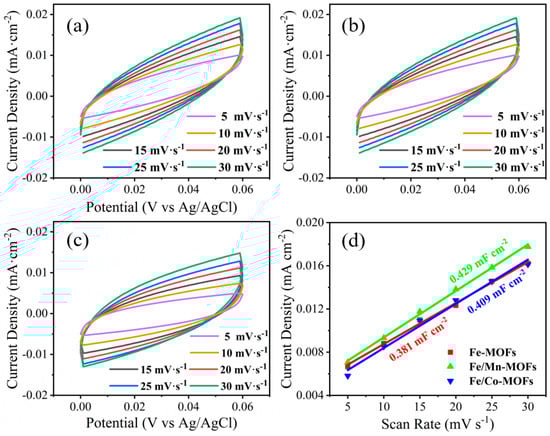 Cyclic voltammetry curves of Fe-MOFs, Fe/Co-MOFs, and Fe/Mn-MOFs catalysts at different sweep velocities (a–c). (d) Electric double-layer capacitance fitting curve.