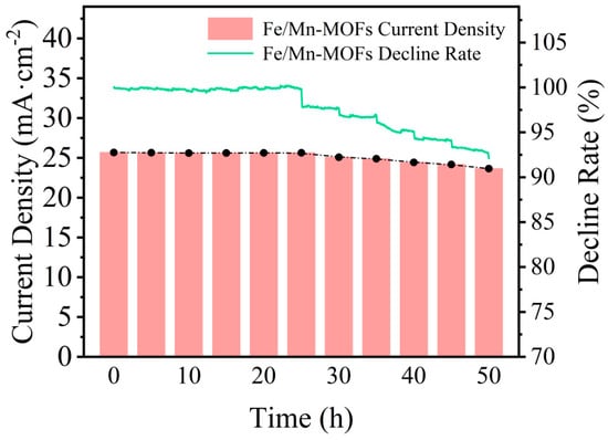 The stability of electrocatalysts is a critical factor in evaluating their practicality for real-world applications []. Building on the impressive catalytic performance of Fe/Mn-MOFs observed in preliminary tests, we systematically assessed their long-term durability through a 50 h chronoamperometric test at a fixed potential of 1.482 V vs. RHE, with the results shown in Figure 7. As depicted in Figure 7, the Fe/Mn-MOFs catalyst exhibited excellent current density stability during the first 25 h of operation, maintaining a steady current density of approximately 25 mA·cm−2. After this period, a gradual decrease in current density was observed, although the decline was minimal throughout the remainder of the test. Importantly, the total current density loss after 50 h of continuous operation was less than 10%, highlighting the catalyst’s exceptional stability in the OER process. This result strongly supports the potential of Fe/Mn-MOFs as a highly stable and efficient electrocatalyst, making it a promising candidate for practical applications in sustainable energy conversion systems.