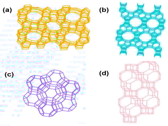 MFI (a), *BEA (b), FAU (c), and CHA-type (d) zeolite frameworks (source from IZA).