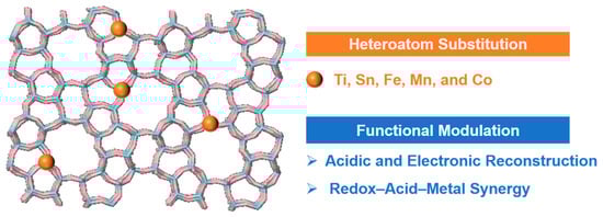 Heteroatom substitution (Ti, Sn, Fe, Mn, or Co) in zeolites modulates acidity and electronic structure, enabling redox–acid–metal synergy for catalytic enhancement (source: the authors).