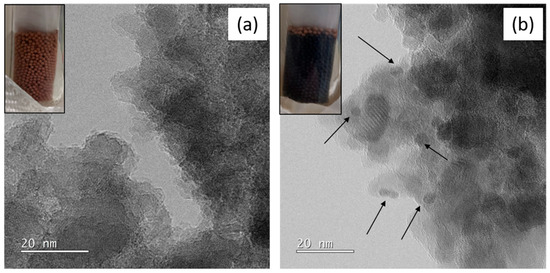TEM images and the images of the catalysts (left upper corner of (a,b)) (a) of the fresh WGSR catalyst (orange-brownish) and (b) the reduced WGSR catalyst (black). The circular, nm scale dark entities shown in (b), which were not found anywhere in the reference, appear to correspond to ruthenium (Ru) nanoparticles.