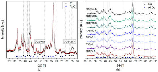 X-ray diffractograms of the catalyst during hydrogen exposure. The (ICDD-database) PDF card numbers are monoclinic θ-Al2O3 (01-086-1410) and metallic Ru (00-006-0663). The catalyst was exposed to an atmosphere of 10% hydrogen in nitrogen for 24 h reduction, during which in situ X-ray diffraction (XRD) measurements were performed at intervals of 4 h. Prior to XRD measurement, the catalyst had already been heated in pure nitrogen and exposed to an atmosphere of 10% CO, 10% H2, and 80% N2. However, the XRD measurements preceding hydrogen exposure showed identical XRD patterns as the reference measurement, and therefore, they are not presented here. (a) XRD measurement at the beginning of the reduction (red, TOS = 0, T = 140 °C) and at the end of the reduction (black, TOS = 24 h, T = 140 °C); (b) In situ X-ray diffraction patterns of the reduction process (every 4 h). αIL = 18%, ζ = 0.67.