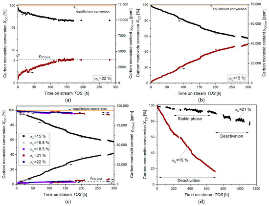Figure 5 shows the conversion curves and CO contents corresponding to the conversion at the end of the catalyst bed of five catalysts, having different filling degrees, as a function of time. The equilibrium conversion at 140 °C is also shown.