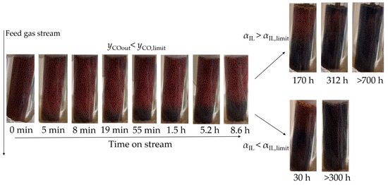 Visual analysis of the reduction of the catalyst bed. The visual analysis confirms the results of the activity tests. At yCOout degrees below 3800 ppm, the catalyst turned black from the bottom. There was a strong color gradient at all times. At filling degrees above the limit (αIL,limit ≈ 16.8–18.5%), the catalyst bed remained like this, with the catalyst above the black part of the catalyst retaining the color it had in the active state. At lower fill degrees, the whole bed turned black.