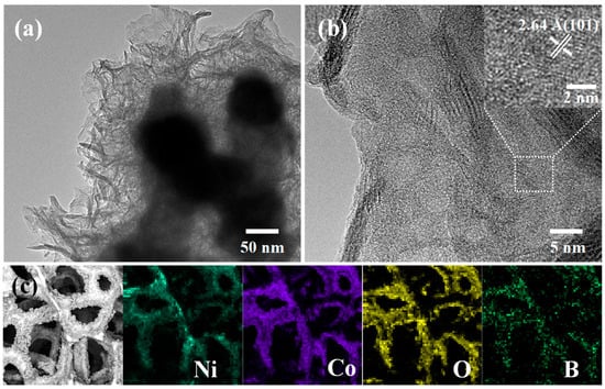 (a,b) TEM images of Co-NiB@NF; (c) EDS image of Co-NiB@NF.