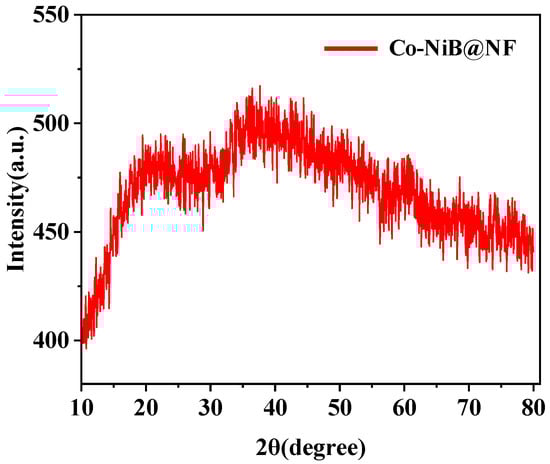 As shown in Figure 1a, Co-NiB@NF exhibits a hierarchical architecture, where primary particles (~100 nm in diameter) are decorated with irregularly grown crumpled nanosheets (~100 nm in depth). High-resolution Transmission Electron Microscopy (TEM) (Figure 1b) reveals discontinuous lattice fringes with short-range ordered but long-range disordered atomic arrangements, characteristic of amorphous materials. Fourier transform analysis of locally ordered regions yielded a lattice spacing of 2.64 Å, indexed to the (101) plane of nickel hydroxide (PDF#01-089-7111). EDS elemental mapping (Figure 1c) confirmed the coexistence of Ni, Co, B, and O, evidencing successful multi-element doping while indicating partial oxidation caused by oxygen exposure during synthesis and storage. The X-ray diffraction (XRD) pattern is shown in Figure 2, displaying significantly broadened diffraction peaks at around 2θ = 20° and 45°. These broad peaks are characteristic of metal borides, indicating the amorphous structure of the Co-NiB@NF catalyst. The weak diffraction peaks of Ni/Co oxides appearing at approximately 2θ = 36° and 60° suggest that surface oxidation of the catalyst occurred during synthesis and storage [7]. During synthesis, Co-NiB@NF initially deposited as reduced metallic boride nanoparticles on the NF substrate. Subsequent self-reconstruction under aerobic conditions generated an amorphous boride-containing oxide/hydroxide overlayer encapsulating the nanocrystalline metallic cores. These boron-derived species act as stabilizing agents, protecting the metallic cores from oxidative degradation during UOR catalysis [8].