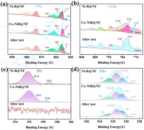 X-ray photoelectron spectroscopy (XPS) was used to analyze the surface chemical states of the Ni-B@NF and Co-NiB@NF catalysts (Figure 3). In the XPS spectrum of Co-NiB@NF, elements such as Ni, Co, B, and O were detected, consistent with the EDS results. The Ni/Co ratio was found to be 8.5:1.5, slightly higher than the 9:1 molar ratio used during synthesis. In the Ni2p spectrum, two prominent peaks at 855.33 eV and 856.33 eV were assigned to Ni2+ and Ni3+ oxidation states, respectively, while a weaker peak at 852.53 eV was assigned to Ni0 (Figure 3a). Similarly, in the Co2p spectrum (Figure 3b), characteristic peaks of Co2+ and Co3+ were detected, along with a weaker Co0 peak [9]. The B1s spectrum shows a small amount of M-B bonds and a large amount of B–O species (Figure 3c). The high-valent nickel and cobalt originate from atmospheric exposure during the preparation and storage process, leading to the formation of Ni/Co oxides and hydroxides on the surface of Co-NiB@NF, although a small amount of unoxidized Ni/Co metals remain [10]. In the B1s spectrum, the B0 characteristic peak of Co-NiB@NF at 189.59 eV shifts negatively by 0.5 eV compared to the B0 peak of Ni-B@NF at 189.09 eV, confirming the successful synthesis of the Co-NiB ternary boride [11]. The O1s spectrum is shown in Figure 3d, indicating that oxygen elements on the surface of Co-NiB@NF are predominantly hydroxyl oxygen, with a small amount of lattice oxygen. The high content of oxygen vacancy species suggests that the amorphous boride possesses a rich defect structure. After electrochemical testing, the B1s signal in Co-NiB@NF completely disappeared, accompanied by a significant increase in M3+ content, indicating that the catalyst underwent further surface reconstruction during the test. The changes in XPS spectra demonstrate that the newly formed oxide layer masked the signals of boron–oxygen species [12,13].