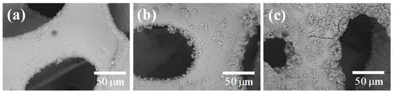 During the in situ synthesis of amorphous Co-NiB@NF catalysts via the SCDM, deposition parameters-specifically the number of deposition cycles and Co precursor ratio-directly governed the morphological evolution of the catalyst layer on the NF substrate. Figure 4 shows SEM images of Co-NiB@NF samples prepared with varying numbers of deposition cycles. As the number of deposition cycles increases, Co-NiB@NF-9 (Figure 4a), Co-NiB@NF-11 (Figure 4b), and Co-NiB@NF-13 (Figure 4c) exhibit significant morphological differences. These morphological changes can be attributed to the layer-by-layer assembly of catalyst particles during the SCDM process. Tests of catalyst loading and performance (Figure S1) indicate that increasing the number of deposition cycles leads to higher catalyst loading (When the number of deposition cycles is 11, the loading amount of Co-NiB@NF is 2.75 mg·cm−2). As a result, Co-NiB@NF-11 exhibits higher performance than Co-NiB@NF-9; however, Co-NiB@NF-13, despite having the highest loading, shows a decline in performance. These results suggest that when the number of deposition cycles is relatively low, the catalyst loading is insufficient. Conversely, when the number of deposition cycles is excessively high, the deposited layer becomes too thick, which adversely affects mass transfer. Thus, an optimal number of deposition cycles yields a porous deposited layer with an appropriate catalyst loading on the NF surface.