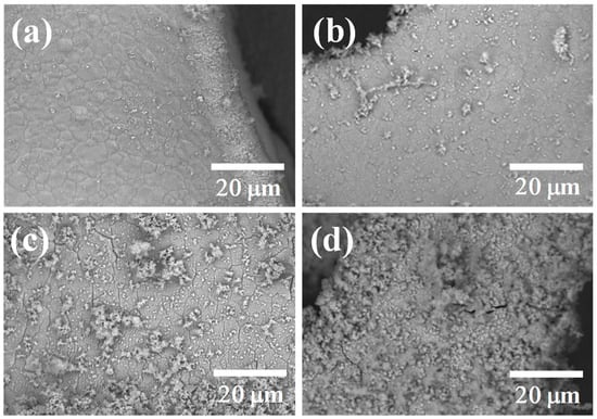 The experimental results indicate that varying the Co precursor ratio has a pronounced influence on the morphology of these amorphous Ni-Co-B catalysts. This effect that has been rarely reported in the literature. Figure 5 presents SEM images corresponding to different Co precursor ratios, revealing a strong correlation between the precursor ratio and the resulting catalyst morphology. As the proportion of Co2+ increases (from Ni-B@NF in Figure 5a to Co-B@NF in Figure 5d), the catalyst morphology changes significantly and systematically. These observations suggest that the presence of Co2+ during the deposition process promotes aggregation of the deposited material, with this tendency becoming stronger at higher Co2+ ratios. Such aggregation directly reduces the number of electrochemically active sites on the catalyst surface, thereby impairing its performance in the UOR (Figure S2).