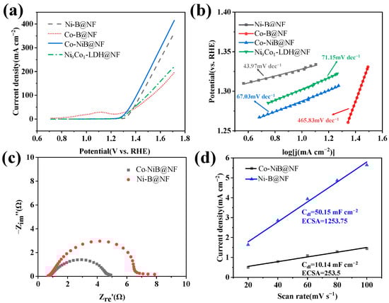 When compared with the monometallic catalysts Ni-B@NF and Co-B@NF, as well as the bimetallic hydroxide Ni9Co1-LDH@NF, Co-NiB@NF demonstrates superior performance. Its Tafel slope is 63.07 mV dec−1 (Figure 6b), which is higher than that of Ni-B@NF (43.97 mV dec−1), indicating that Co doping does not fully exert a positive effect. The electrochemical impedance spectroscopy (EIS) in Figure 6c and the double-layer capacitance measurements in Figure S3 and Figure 6d show that the introduction of a small amount of Co not only significantly reduces the charge transfer resistance of Co-NiB@NF but also decreases its electrochemical active surface area.