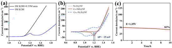 Figure 6a shows that the Co-NiB@NF catalyst exhibits optimal UOR catalytic performance, achieving a current density of 10 mA cm−2 at only 1.29 V, and reaching 100 mA cm−2 at 1.41 V. Under identical test parameters, when evaluating the OER performance of this catalyst in 1 M KOH, a potential of 1.77 V is required to achieve a current density of 100 mA cm−2 (Figure 7a). Furthermore, in a 10 h chronoamperometry test, the current density shows only a small decrease (Figure 7c), indicating excellent stability. This performance is comparable to most previously reported transition metal-based catalysts (Table 1).