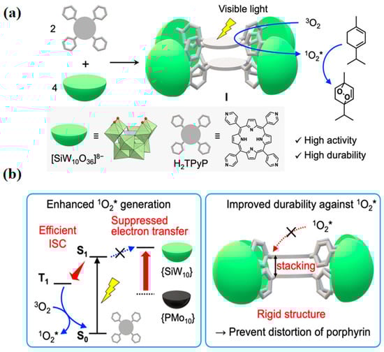 In another report, Li et al. [40] synthesized an organic–inorganic hybrid material based on POM using the hydrothermal method: [Ni6(trz)2(Htrz)13][H4P4Mo11O50]·7H2O. In this compound, each [H4P4Mo11O50] cluster serves as a four-membered node bridging four [Ni6(trz)2(Htrz)13] SBUs. Photocatalytic results indicate that the composite exhibits excellent stability and a broad response range under visible light. The photocatalytic mechanism was confirmed through Mott–Schottky, photocurrent, and fluorescence quenching experiments, providing new insights for the development of efficient POM-based catalysts. To optimize electron transfer efficiency, Yamaguchi et al. [41] developed and reported a novel porphyrin–polyoxotungstate molecular hybrid photocatalyst. The structure of this hybrid, referred to as hybrid I, consists of face-to-face stacked dimers of 5,10,15,20-tetrakis(4-pyridyl)porphyrin (H2TPyP), anchored by four double-deficient polyoxotungstates ([SiW10O36]8−) with bridging units (Figure 2a). This innovative structural design enables efficient electronic coupling between the porphyrin and polyoxotungstate, significantly enhancing electron transfer during the photocatalytic process (Figure 2b). The porphyrin–polyoxotungstate hybrids exhibit exceptional photocatalytic activity, primarily owing to the heavy-atom effect associated with POMs. This effect greatly facilitates the intersystem crossing from photoexcited singlet to triplet states, leading to improved light energy utilization and enhanced catalytic activity. Furthermore, by fine-tuning the energy level of the lowest unoccupied molecular orbital of the polyoxotungstates, the electron transfer process can be precisely regulated, further optimizing photocatalytic efficiency. Importantly, the heavy-atom effect of polyoxotungstates is crucial in promoting the generation of singlet oxygen (1O2).
