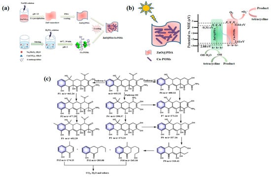 (a) Process diagram for the preparation of ZnO@PDA/Cu-POMs. (b) The proposed photocatalytic mechanism for degrading TC. (c) The proposed degradation pathways. Reprinted with permission from Elsevier [45].