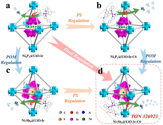 The dual regulation of POMs and PSs in POM@MOF for PHE with (a) Ni4P2@UiO−Ir, (b) Ni4P2@UiO−Ir−C6, (c) Ni−Sb9@UiO−Ir, and (d) Ni−Sb9@UiO−Ir−C6 as structural models. Reprinted with permission from Wiley [25].