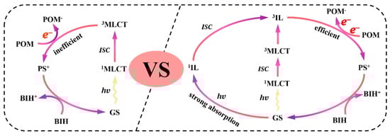 In recent years, the encapsulation of POMs within the cage-like structures of metal–organic frameworks (MOFs) has led to the development of POMs-based MOF crystalline materials (POMs@MOFs), providing a valuable new avenue for understanding electron transfer mechanisms in photocatalytic reactions [22,46]. In the POM@MOF composite system, the MOF serves as a matrix that exhibits a remarkable long-range ordered spatial structure, endowing the material with a highly regular pore network [47]. These pores not only create an ideal microenvironment for hosting POMs but also facilitate their homogeneous dispersion at the molecular level, maximizing the catalytic activity of the POMs [30]. Importantly, this innovative structural design optimizes the separation and transport efficiency of photogenerated carriers, significantly enhancing the overall performance of photocatalytic reactions [31,48,49]. For instance, Guo et al. [25] employed an in situ assembly strategy to thermally process mixtures of ZrCl4, H2L2/H2L1/H2L3, and Ni-Sb9/Co-Sb9/Ni4P2 (in varying molar ratios) to synthesize novel Ni-Sb9@UiO-Ir-C6 composites. This method achieves dual regulation of the sensitization and catalytic centers in Ni4P2@UiO-Ir (Figure 4). Experimental studies indicated that this dual modulation strategy enhances the exposure of active sites within the POM@MOF composites, improves visible light absorption, and facilitates efficient charge transfer between components, thereby significantly boosting catalytic activity. Scanning electron microscopy (SEM) and high-angle annular dark-field scanning transmission electron microscopy (HAADF-STEM) characterization results revealed that Ni-Sb9@UiO-Ir-C6 possesses a porous surface with a regular octahedral morphology. The elements C, N, O, S, Zr, Ir, Ni, and W are uniformly distributed throughout the MOF’s framework, further confirming the successful incorporation of Ni-Sb9 and Ir-C6 (Figure 5). This homogeneous distribution not only optimizes the structural properties of the materials but also provides additional active sites for the photocatalytic reaction, significantly enhancing their catalytic efficiency. As shown in Figure 6, the light absorption process mainly involves transitions from the ground state (So) to the singlet excited state (1IL). The long-lived triplet excited state (3IL) is obtained through intersystem crossing (ISC). Subsequently, electrons efficiently transfer from the 3IL state to the Ni−Sb9 site of [NiO3(H2O)3], thereby achieving a photocatalytic enhancement mechanism characterized by strong visible light absorption, long excited state lifetime, and efficient electron transfer.