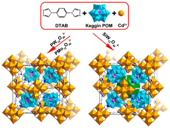 Du et al. [27] successfully developed a series of novel Keggin-type polyoxometalate-encapsulated cadmium cluster organic framework crystalline materials (POM@CdMOF) through a one-pot hydrothermal synthesis involving CdCl2·5/2H2O, DTAB, and Keggin-type polyoxometalates (Figure 7). Single-crystal X-ray diffraction (SCXRD) analysis revealed that the POM@CdMOF crystals possess an iso-network structure, with different POM guests encapsulated within the same CdMOF cationic host framework. The varying POM guests exhibited distinct electron transfer pathways and charge separation behaviors within the photoactive CdMOF host, leading to different photocatalytic activities. DFT calculations highlighted the crucial regulatory roles of the different POM units in interfacial electron transfer and the adsorption behaviors of key intermediates.