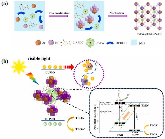 (a) Illustration of the synthesis of CsPW@UNH (Hf-Zr) samples. (b) The photocatalytic mechanism for CsPW@UNH(0.65Hf) composite. Reprinted with permission from Elsevier [51].