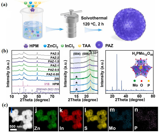 (a) Schematic synthesis process of HPM-incorporated ZIS nanohybrids (PAZ). (b) XRD patterns and enlarged part of HPM, ZIS, and PAZ-x samples. (c) HAADF-STEM image of PAZ-1 and corresponding elemental mappings. Reprinted with permission from Elsevier [54].