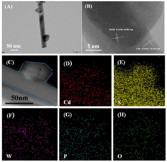 (A) presents the TEM image of CdS-NRs@PW12O40 (C), while (B) displays the HRTEM image of the same material. Additionally, (D–H) illustrate the elemental mapping of CdS-NRs@PW12O40 (C). Reprinted with permission from Elsevier [55].