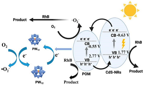 In another report, Ren et al. [55] successfully deposited a series of POMs, including H3PW12O40, H3PMo12O40, and [TBA(MnMo6)], onto the surface of CdS nanorods (CdS-NRs) to create a binary composite material using a straightforward deposition strategy. The CdS-NRs served as an effective support for the POMs, which extended the visible light absorption range, reduced the rate of electron–hole recombination, and enhanced the photogenerated charge transfer, ultimately leading to remarkable photocatalytic performance. TEM results confirmed the successful immobilization of POM crystals on the CdS-NRs, demonstrating the formation of a binary system (Figure 10A–C). The difference in transparency between the two phases indicated a strong interaction between the POM crystals and the CdS-NRs. Notably, the lattice fringe with a spacing of 0.316 nm corresponds to the CdS-NRs within the composite, while the lattice fringe associated with the POM crystals supported on the surface of the CdS-NRs is measured at 0.86 nm. Additionally, elemental mapping further demonstrated that the POMs are uniformly dispersed on the surface of the carriers (Figure 10D–H). The possible photocatalytic mechanism is shown in Figure 11. Under light irradiation, POMs cause oxygen–tungsten charge transfer and generate excited species (POM*). Within the POM cage, an O2p → W5d orbital transition occurs, with charge transfer from O2− to the W6+ in the W-O-W group of POM, resulting in the formation of a pair of holes and a trapped electron center (W5+), which oxidizes and decomposes organic dyes. Their research has opened up a new viable path for the design of novel heterostructure photocatalysts using POMs and sulfides to eliminate pollutants in water. Tang et al. [56] presented a novel photocatalytic material that combines nickel (Ni)-doped polyoxometalate K6Na4[Ni4(H2O)2(PW9O34)2]·32H2O (Ni4POM) with a CdxZn1−xS solid solution. The unique integration of multivalent Ni centers and an S-scheme charge transfer pathway in this material significantly enhances the separation and transfer efficiency of photogenerated charges. Specifically, the Ni centers introduce additional energy levels within the band structure, facilitating the trapping and transfer of photogenerated electrons. Meanwhile, the S-scheme charge transfer mechanism ensures the efficient separation and transport of electrons and holes to the material’s surface, thereby minimizing recombination losses. This synergistic effect not only improves overall charge dynamics but also broadens the visible-light absorption range, allowing the material to capture and utilize a wider spectrum of solar energy for photocatalytic reactions.