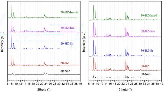 - Ngo, P.T.; Vo, P.N.X.; Trinh-Le, L.P.; Pham, D.T.; Phan, P.D.; Cao, C.V.; Tran, T.V.; Luong, T.N.; Ha, Q.L.M.; Le-Phuc, N. Role of e-beam irradiation treatment on detemplation and structural hierarchy of ZSM-5 zeolite. Micropor. Mesopor. Mat. 2021, 315, 110928. [Google Scholar] [CrossRef]