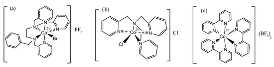 - Chan, S.L.-F.; Lam, T.L.; Yang, C.; Lai, J.; Cao, B.; Zhou, Z.; Zhu, Q. Cobalt(II) tris(2-pyridylmethyl)amine complexes [Co(TPA)X] + bearing co- ordinating anion (X = Cl−, Br−, I− and NCS−): Synthesis and application for carbon dioxide reduction. Polyhedron 2017, 125, 156–163. [Google Scholar] [CrossRef]