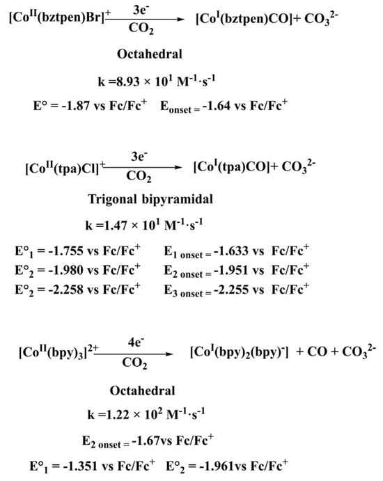 Rocha-Ortiz, G.; Barrios-Velasco, A.; Monsalvo Zúñiga, O.; Cruz-Ramírez, M.; Mendoza, A.; Ramírez-Palma, L.G.; Rebolledo-Chávez, J.P.F.; Ortiz-Frade, L. The Role of Geometry in Cobalt–Polypyridine Complexes in the Electrochemical Reduction of CO2 Using UV-Vis Spectroelectrochemistry. Catalysts 2025, 15, 641. https://doi.org/10.3390/catal15070641
