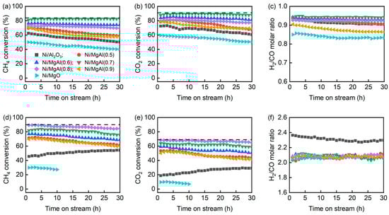 The catalytic activities of Ni/MgAl(x) in both the DRM and CSCRM are superior to those of Ni/Al2O3 and Ni/MgO, highlighting the promoting effect of MgO and Al2O3 mixed oxides. In general, the activity of Ni/MgAl(x) initially increases with the increasing x, reaches a maximum, and then declines. However, the optimal catalysts for the DRM and CSCRM differ. For the DRM, Ni/MgAl(0.7) shows the best performance, maintaining a high and stable CH4 conversion (81.0–82.3%) and CO2 conversion (87.9–89.6%) over 30 h. In contrast, for the CSCRM, Ni/MgAl(0.8) is the most effective catalyst, with the CH4 conversion slightly decreasing from 89.4% to 84.5% and the CO2 conversion decreasing from 68.2% to 64.8% over the same period.