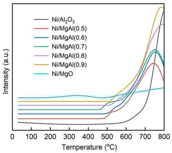 Figure 2 shows the H2-TPR profiles of Ni/Al2O3, Ni/MgO, and Ni/MgAl(x), with the maximum temperature limited to 800 °C due to instrument constraints. All catalysts except Ni/MgO exhibit a prominent high-temperature reduction peak centered between 700 and 800 °C, which is indicative of strong metal–support interactions [31]. In contrast, Ni/MgO shows no distinct peak but instead displays a gradually increasing H2 consumption curve up to 800 °C, suggesting that the Ni species in this catalyst are extremely difficult to reduce. This behavior is attributed to the formation of a MgO-NiO solid solution, facilitated by the shared face-centered cubic structure of NiO and MgO, which significantly impedes the reduction [32]. Compared to Ni/MgO and Ni/Al2O3, the Ni/MgAl(x) catalysts show a relatively easier reduction. As the value of x increases from 0.5 to 0.9, the reduction peak temperature gradually rises from 740 to 780 °C, implying that the reducibility of Ni/MgAl(x) is dependent on the Mg/Al ratio. Similar findings have been reported by other researchers [21,33,34]. Tao et al. [21] demonstrated that excessive Mg occupies the octahedral sites in the nonstoichiometric Ni-doped MgAl2O4 spinel, thereby impeding the reduction of Ni species. It should be noted that the supports (Al2O3, MgO, and MgAl(x)) themselves display no reduction peaks, confirming the absence of reducible species in the support materials.