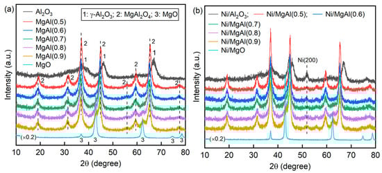 The N2 adsorption–desorption isotherms and pore size distribution curves of the supports and catalysts are presented in Figures S1 and S2, with the textural data (specific surface area, pore volume, and average pore diameter) summarized in Table 1. All supports and catalysts exhibit IV hysteresis loops and unimodal mesoporous structures [30]. The specific surface area and pore volume of Al2O3 are significantly higher than those of MgO. For the mixed oxide supports, as the Mg/Al ratio increases from 0.5 to 0.9, the surface area and pore volume initially increase and then decrease, with MgAl (0.8) showing the highest values. This suggests that the textural properties of the supports can be tuned by adjusting the Mg/Al ratio. After the Ni loading on the support, the specific surface area of each catalyst, except for Ni/MgO, decreases as expected compared to the support. However, the surface area of Ni/MgO is nearly twice that of MgO, likely due to the formation of smaller particles.