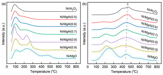 The interactions of CO2 with the catalysts can be analyzed using CO2-TPD. Figure S4 and Figure 5a show the CO2-TPD profiles of the supports and catalysts, respectively. The desorption peaks below 200 °C, between 200 and 400 °C, and above 400 °C are generally assigned to the release of carbon oxides from weak, medium, and strong basic sites, respectively [41,42,43]. The total basicity of each sample, which reflects the overall number of basic sites, can be estimated by integrating the areas of all desorption peaks. Compared to the supports, the catalysts exhibit a reduced total basicity due to the coverage of basic sites by Ni particles. Among the catalysts, Ni/Al2O3 shows the lowest total basicity, consisting exclusively of weak basic sites. In contrast, Ni/MgO exhibits the highest total basicity, encompassing weak, medium, and strong basic sites. Ni/MgAl(x) contains both weak and medium basic sites, and as x increases, both the total basicity and the proportion of medium basic sites increase. Accordingly, the strength of CO2–catalyst interactions follow the order of Ni/Al2O3 < Ni/MgAl(0.5) < Ni/MgAl(0.6) < Ni/MgAl(0.7) < Ni/MgAl(0.8) < Ni/MgAl(0.9) < Ni/MgO.