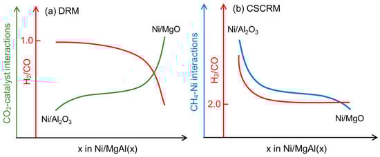 The H2/CO molar ratio in the DRM is influenced by the CO2–catalyst interactions or the basicity of the catalysts (Figure 6a). Previous studies have shown that an increased catalyst basicity enhances CO2 adsorption and activation, as well as the CO selectivity in the RWGS [49,50]. Considering that Ni/MgO has the highest total basicity and the strongest CO2–catalyst interactions, more RWGSs are expected to occur on this catalyst, resulting in the lowest H2/CO ratio (Figure 1c). Likewise, Ni/MgAl(0.9), with the second-highest basic strength, exhibits the second-lowest H2/CO ratio. In contrast, the H2/CO ratio in the CSCRM is likely affected by the CH4–Ni interactions (Figure 6b). Ni/Al2O3 displays the strongest CH4–Ni interactions and CH4 adsorption, which are likely to promote the CH4 decomposition [51]. Additionally, the acid sites of γ-Al2O3 can further facilitate the CH4 decomposition [23,36,52]. As a result, Ni/Al2O3 yields a notably higher H2/CO in the CSCRM compared to the other catalysts (Figure 1f).