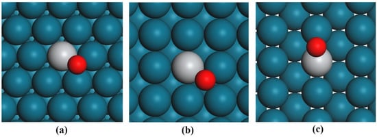 In this study, three low-index crystallographic planes ((111), (100), and (110)) were selected for investigation due to their prevalence as dominant facets in bimetallic alloys [,], and the results showed that the surface energies for the (111), (100), and (110) surfaces of Pd were 1.33, 1.50, and 1.58 J/m2, respectively, in agreement with previous calculations []. Structural models comprised pure Pd and Pd–Ti alloy configurations that were constructed using a slab of six atomic layers representing 2 × 2 supercells containing 24 atoms for the (111), (100), and (110) surfaces. For the Pd–Ti alloy models, the configurations were generated by replacing one of the Pd atoms with a Ti atom in the first, second, third, and fourth layers of the pure metal Pd surface, respectively. Therefore, the concentrations of Pd and Ti are 23/24 and 1/24, respectively. Based on prior studies of bimetallic systems [,,,], a six-layer slab was shown to balance computational cost and accuracy in surface energy and adsorption property calculations. To minimize periodic boundary interactions, a 15 Å vacuum space was introduced between adjacent slabs, and a single oxygen atom was positioned on the alloy surface. The atomic positions for all layers except the bottom two were iteratively optimized until residual forces converged below 0.02 eV/Å. In contrast, the constrained bottom two layers retained bulk geometric parameters, including the equilibrium lattice constant of 3.94 Å for Pd, which is consistent with previously reported values []. By performing a convergence test on the slab thickness, we found that the number of layers fixed was sufficient for modeling the bulk characteristics.