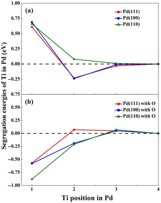 To determine the location preference of Ti in Pd matrices, we calculated the segregation energies of a single Ti atom embedded in Pd using Equation (1). Figure 2 illustrates the segregation energy trends for Ti across Pd(111), (100), and (110) surfaces with and without adsorbed oxygen. In the absence of oxygen (Figure 2a), Ti exhibits positive segregation energies at the topmost surface layers, indicating thermodynamic instability at these positions. This behavior aligns with the higher surface energy of Ti (2.1 eV/atom) compared to Pd (2.05 eV/atom) [], as elements with elevated surface energies typically resist surface segregation in metallic alloys [,]. Notably, Ti prefers subsurface or bulk regions: For Pd(111) and (100) surfaces, segregation energies at the subsurface layers are −0.23 eV and −0.24 eV, respectively, contrasting with positive values (0.61–0.69 eV) at the topmost layers. This suggests that the topmost Pd layer acts as a barrier against Ti segregation. However, on Pd(110), Ti’s most stable location shifts deeper into the bulk (fourth layer), with near-zero segregation energies at the third layer, reflecting bulk-like behavior. The distinct segregation trend on Pd(110) arises from its unique topology, where atoms in the second layer retain surface-like coordination [].
