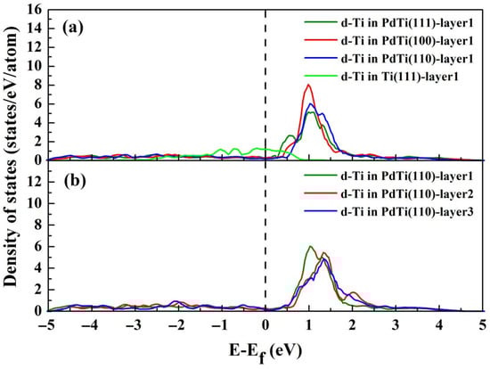 The electronic density of states (DOS) serves as a critical tool for probing the electronic characteristics of transition metal alloys, particularly their catalytic behavior. To elucidate the role of local coordination and adsorbate interactions, we calculated the d-band DOS for the Ti atom in Pd–Ti systems without oxygen adsorption. Figure 3a illustrates the d-band DOS for the Ti atom located in the first layer of Pd–Ti(111), Ti(111), Pd–Ti(100), and Pd–Ti(110) surfaces under vacuum. Notably, embedding Ti within the Pd(111) surface induces significant narrowing of its d-band compared to the pure Ti(111) surface. This phenomenon is attributed to lattice strain effects. This narrowing arises from Ti’s larger atomic radius relative to Pd, generating localized tensile strain at the surface. Consequently, electron density occupancy decreases, compressing the d-band width and shifting the d-band center upward toward the Fermi level to preserve orbital filling integrity []. In addition, we observe that the alloyed Ti’s d-band center lies above the Fermi level. This further confirms that the high electronegativity of Pd leads to Ti charge loss. By comparing the positions of the d-band center for the Ti atom on the Pd–Ti(111), Pd–Ti(100), and Pd–Ti(110) surfaces under vacuum, we observe that peak positions correlate with the density of accessible d-states, where reduced atomic coordination elevates the d-band center toward higher energies. This electronic redistribution enhances orbital hybridization capacity at low-coordination sites, directly rationalizing the strengthened oxygen binding affinity quantified in Table 1. Figure 3b shows the d-band DOS variations in Ti atoms positioned on the first, second, and third layers of the Pd(110) surface in the absence of adsorbed oxygen. Significant alterations in the shape and energy alignment of the Ti d-band DOS occur as Ti migrates from bulk regions to surface sites. Specifically, the primary d-band peak associated with Ti in the topmost layer exhibits greater intensity and shifts markedly closer to the Fermi level, implying that surface energy considerations predominantly dictate Ti’s preferential occupation of bulk regions.