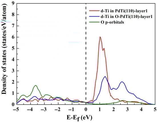 Figure 4 demonstrates significant modifications to the d-band DOS of Ti in the Pd–Ti(110) system upon oxygen interaction compared to the pristine surface (i.e., without adsorbed oxygen). Calculations show that oxygen adsorption leads to a significant upward shift in the center of the d-band of Ti atoms on the surface of Pd–Ti(110). This upward shift in the d-band center will induce an increase in the number of unoccupied anti-bonding states and enhance the strength of adsorption between Ti and O, which is conducive to driving the segregation of sub-surface Ti towards the surface and the formation of the Ti-rich surface layer. Notably, oxygen adsorption also induces a marked broadening of the Ti d-band DOS. The narrowed DOS distributions observed for surface atoms are straightforward to interpret, as reduced coordination numbers relative to bulk counterparts limit orbital overlap. In adsorption scenarios, the increased local coordination of surface atoms caused by adsorbates counteracts this narrowing effect, leading to DOS broadening through enhanced orbital hybridization []. Additionally, pronounced overlap between O p-states and Ti d-states is observed, with unoccupied O–Ti anti-bonding states positioned above the Fermi level. This electronic configuration facilitates robust covalent hybridization between Ti and oxygen, a critical feature for catalytic interaction strength.