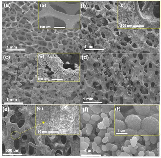 Scanning electron microscopy (SEM) was employed to meticulously analyze the surface morphology and microstructural features of the fabricated electrodes—bare nickel foam (NF), NiP/NF, PNC/NF, and NiP@PNC/NF—with comprehensive results presented in Figure 2. These images provide critical insights into the electrodes’ surface topography, structural configuration, and material distribution, confirming their suitability for electrocatalytic applications. Figure 2a (and its inset) showcases an SEM image of pristine NF, revealing a three-dimensional, highly porous framework characterized by a smooth surface and an interconnected lattice of macropores, ranging from approximately 50 to 500 μm in size [26,36]. This open, sponge-like structure maximizes the surface area, promoting efficient electrolyte diffusion and gas evolution during electrocatalytic processes. In Figure 2b (and inset), the NiP/NF electrode displays a non-uniform coating of nickel phosphide (NiP), comprising nanoparticles and small aggregates with sizes spanning 20 to 200 nanometers. The NiP preferentially accumulates in the NF’s recessed areas, corners, and crevices, forming a roughened surface that enhances catalytic activity while maintaining substrate conductivity through partially exposed NF regions. Figure 2c (and inset) illustrates the PNC/NF electrode, featuring a uniform, conformal coating of phosphorus and nitrogen co-doped carbon nanotubes (PNCs) on the NF substrate. The P, N co-doping introduces lattice imperfections and heteroatom incorporation, boosting electrical conductivity and electrocatalytic efficiency while preserving the NF’s macroporous architecture for optimal electrolyte access and an expanded electrochemically active surface area. Figure 2d,e depict the NiP@PNC/NF electrode, highlighting a sophisticated, hierarchical morphology driven by the synergistic integration of PNC and NiP. The PNC forms a web-like foundational layer that evenly coats the NF, with NiP nanoparticles intimately bonded to the CNTs, enhancing charge transfer and catalytic synergy, as evidenced in high-magnification views. High-resolution SEM images in Figure 2f (and inset) further validate the uniform dispersion of PNC and NiP across the NF, demonstrating structural integrity with minimal aggregation or uncoated regions. This consistent coating reflects the success of the synthesis and deposition process, achieving a harmonious blend of conductive PNC and catalytically active NiP, significantly elevating the electrode’s performance in UOR.